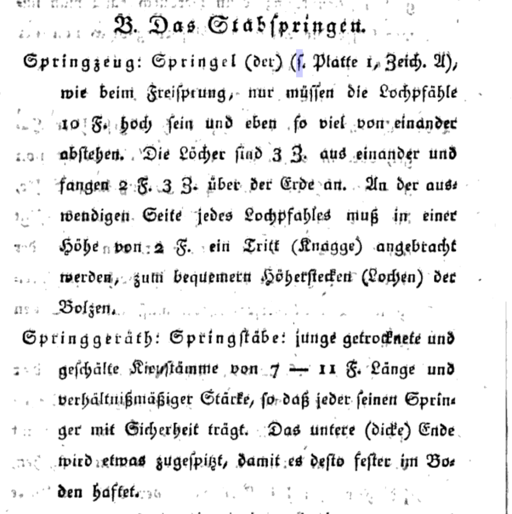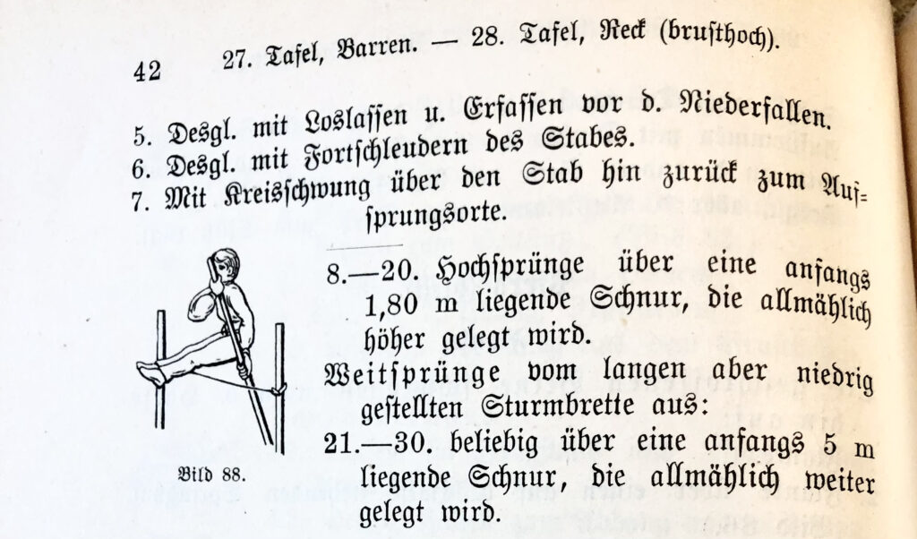 Jahn, who is considered the father of gymnastics (der Turnvater) in Germany, wrote about track and field events in the first edition of his book Die Deutsche Turnkunst (German Gymnastics). For example, he wrote about the high jump: