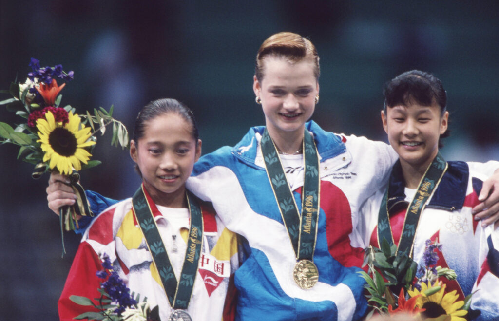 Gold medal winner Svetlana Khorkina of Russia (C) stands with Ling Jie of China (L) and Yang Yun of China (R), 24 September 2000 following their uneven bars routine in the women’s apparatus finals at the Sydney 2000 Olympic Games. (Photo by WILLIAM WEST/AFP via Getty Images)