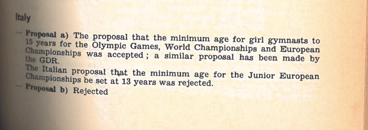 The 1980 FIG Congress saw parallel proposals from Italy and East Germany addressing concerns about very young gymnasts competing at elite levels:
