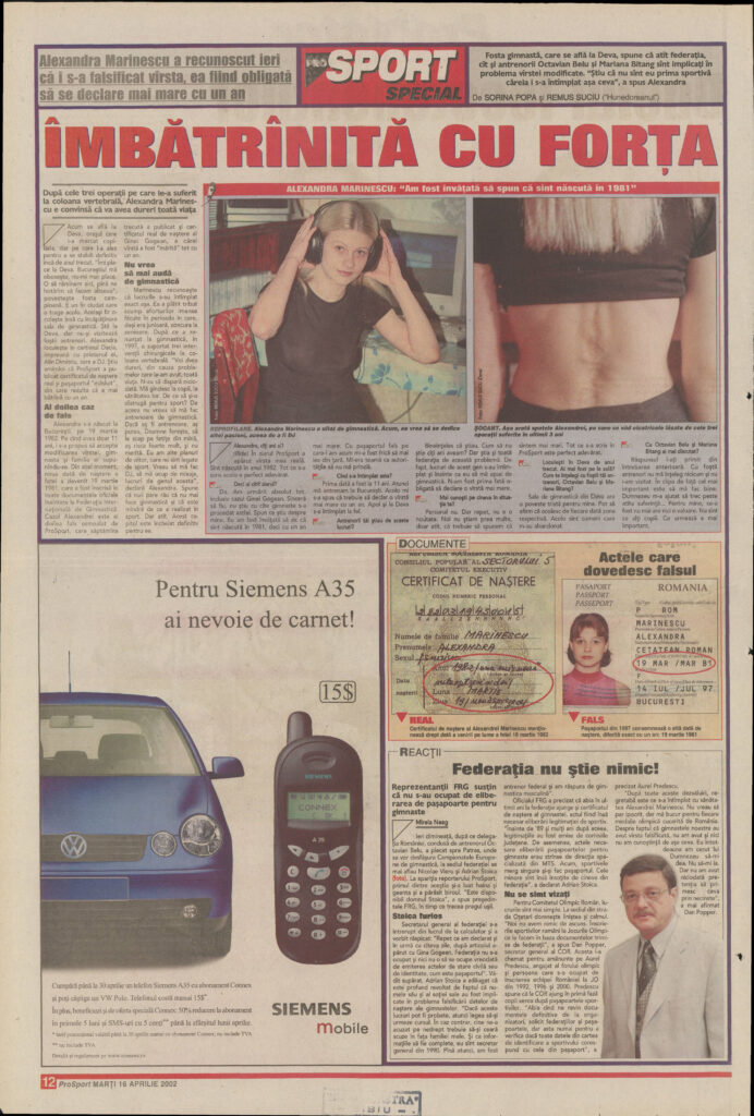 The week after revealing Gina Gogean’s age falsification, ProSport published a second case. But where Gogean’s career had been “fulfilled” and “decorated with medals,” Alexandra Marinescu’s story ended in spinal surgeries and permanent pain. Between April 15 and April 17, 2002, the newspaper documented how the Romanian Gymnastics Federation falsified Marinescu’s birth date, who made the decision, and what it cost her. What follows is a synthesis of that three-day investigation.