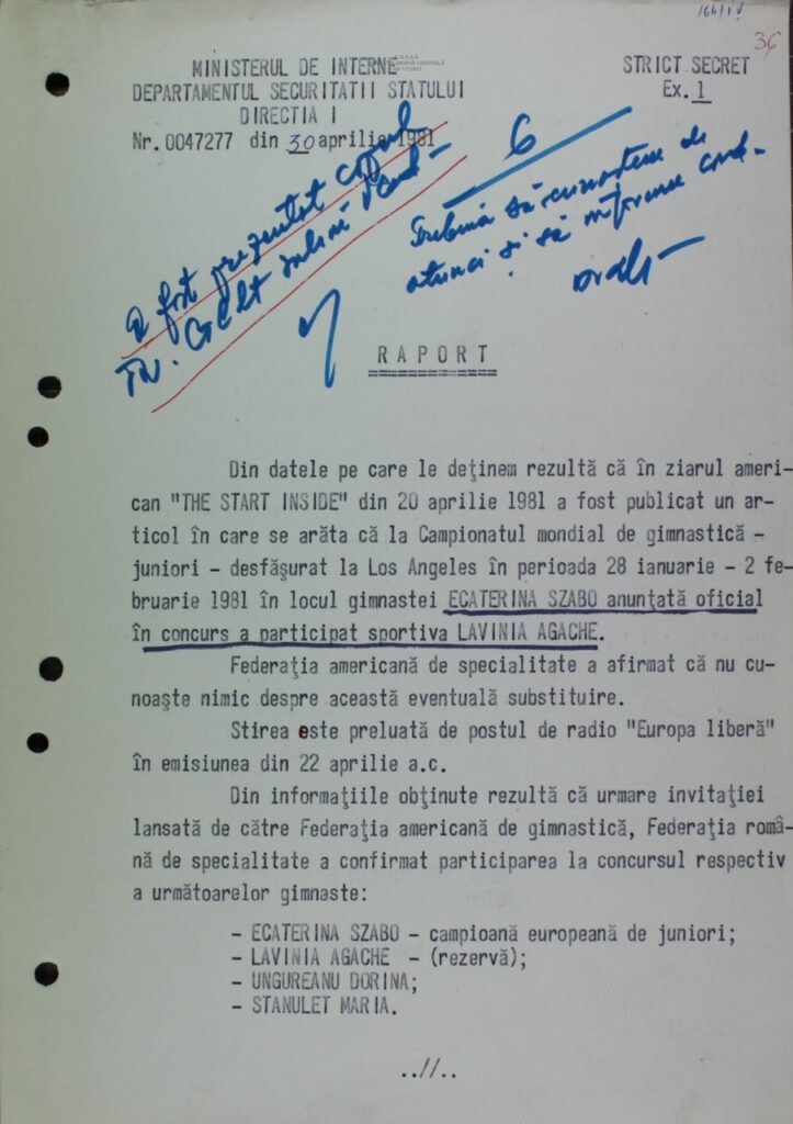 Five days after Bangerter’s letter, Ion Munteanu—a Romanian state security official—submitted an internal report explaining what had happened. According to Munteanu, the Romanian federation had originally confirmed that Szabó would compete in Los Angeles, with Agache listed as reserve. But for unspecified “technical reasons,” officials decided Agache would make the trip instead, accompanied by coach Béla Károlyi.
