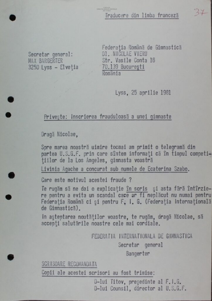 On April 25, after NBC’s broadcast, Max Bangerter, General Secretary of the International Gymnastics Federation, wrote to Nicolae Vieru, the president of the Romanian Gymnastics Federation: