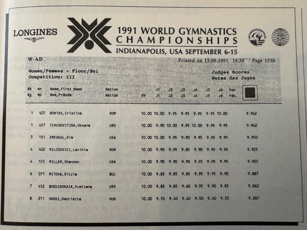 [Below] is the scoresheet from floor exercise finals at the ’91 World Championships. Note the wide range of scores for Boginskaya. Also, Judge 5 ranked six of the eight finalists at 9.95. ‘SV’ (column one) is the starting value of each routine.