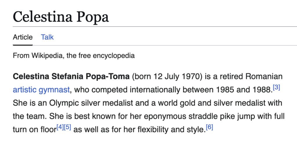 Celestina Popa was born in 1971. Throughout her senior career, however, she competed under a fabricated birth year of 1970. The discrepancy sounds small. But a year is a year, and rules are rules. And in 1985, the minimum age for the World Championships was fifteen. Popa was fourteen. Under her real birthdate, Popa was ineligible, but by adjusting her paperwork, the federation made her eligible to help the Romanian team win the silver medal in Montréal.