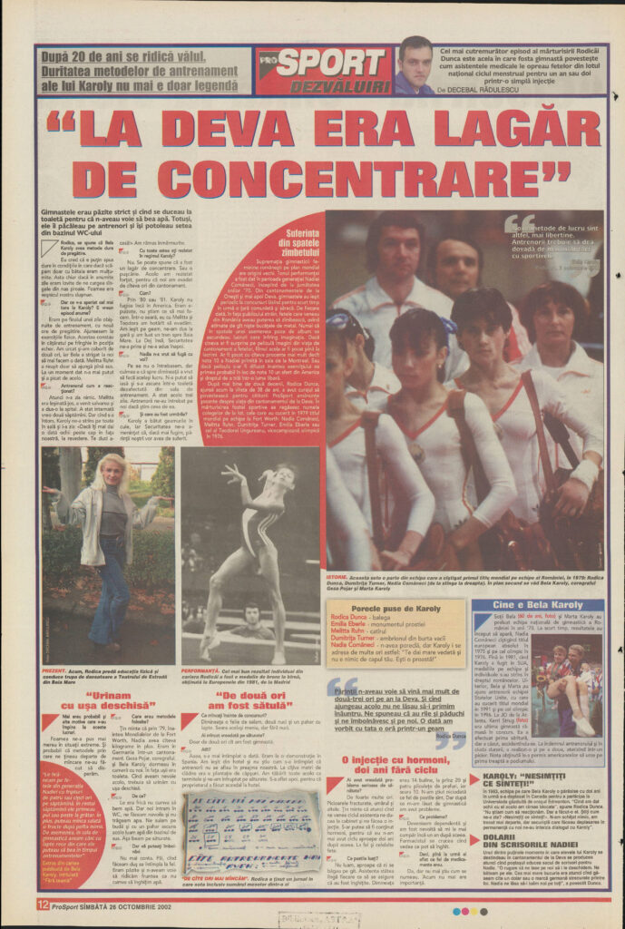 After more than two decades, Rodica Dunca, now 38 years old, found the courage to tell ProSport readers shocking details about life in the Deva training camp. In the testimony of the former athlete appear the names of her teammates from the national squad, the women who won the 1979 world team title in Fort Worth: Nadia Comăneci, Melitta Rühn, Dumitrița Turner, Emilia Eberle, as well as Teodora Ungureanu, Olympic silver medalist in 1976.