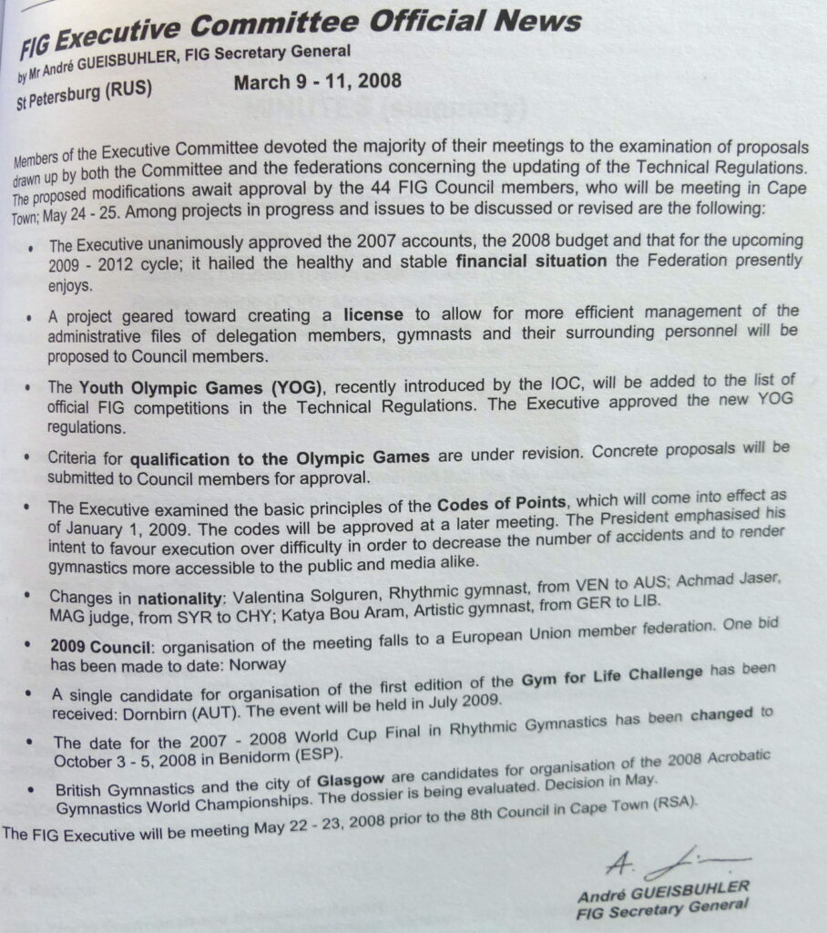By May of that year, the FIG announced that, as of January 1, 2009, any senior or junior gymnast wishing to compete internationally would be required to hold such a license. The license fixed an athlete’s name, nationality, discipline, and—crucially—date of birth in a central database. Without it, an athlete could not compete.