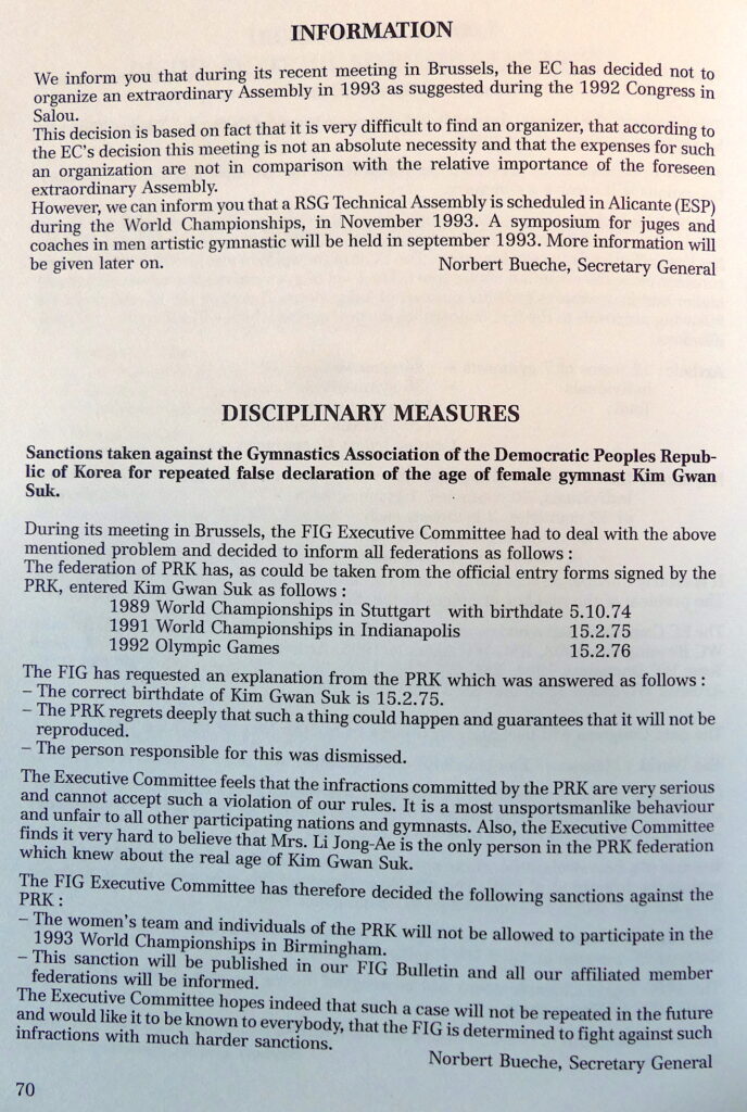 The FIG announced its decision in January 1993. The Swiss newspaper Le Nouvelliste quoted Secretary General Norbert Bueche explaining the discovery: “During a routine passport check for the Birmingham championships, it was found that Kim Gwang-Suk had been registered with three different dates of birth at the 1989 and 1991 World Championships and at the Barcelona Olympic Games.”