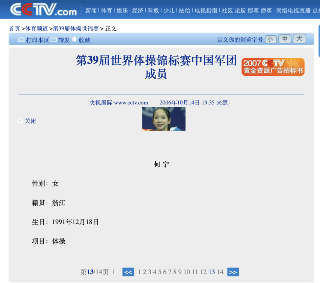 He Ning’s CCTV profile, dated October 14, 2006, lists her birthdate as December 18, 1991. CCTV (China Central Television), the country’s primary state-run broadcaster, operates under the Chinese government and serves as a central voice for official news and programming both domestically and internationally. In other words, this biography carried real weight—it was not simply a date on a fan blog.