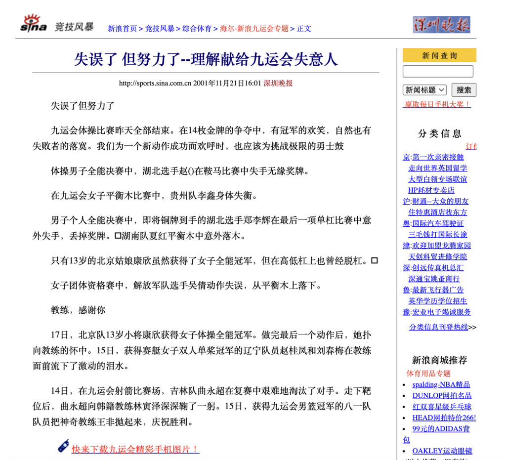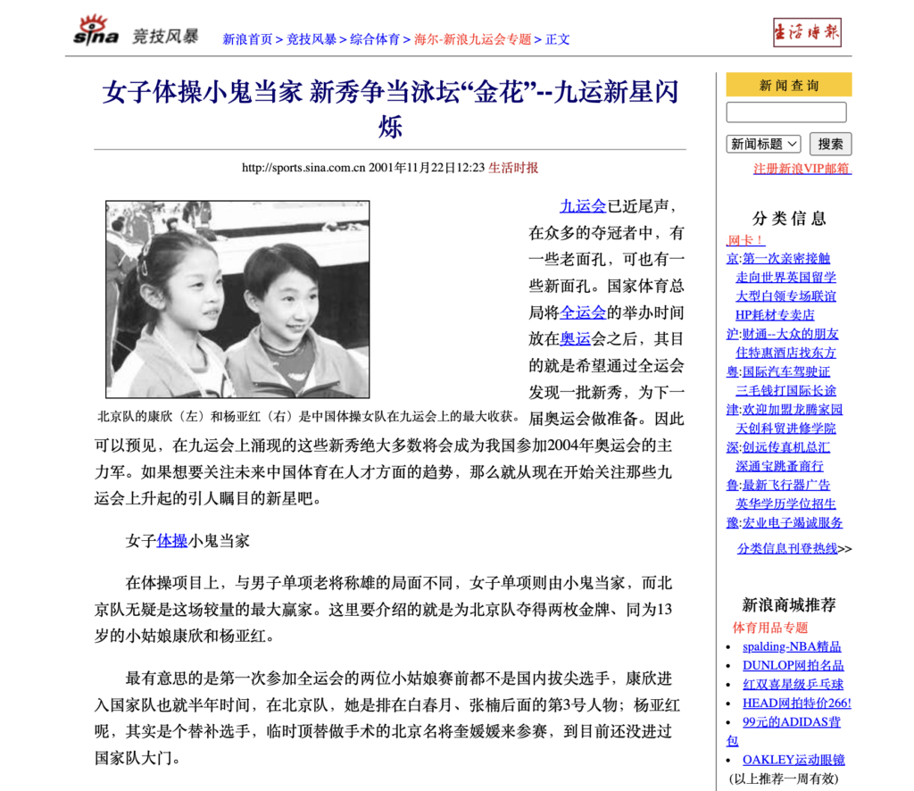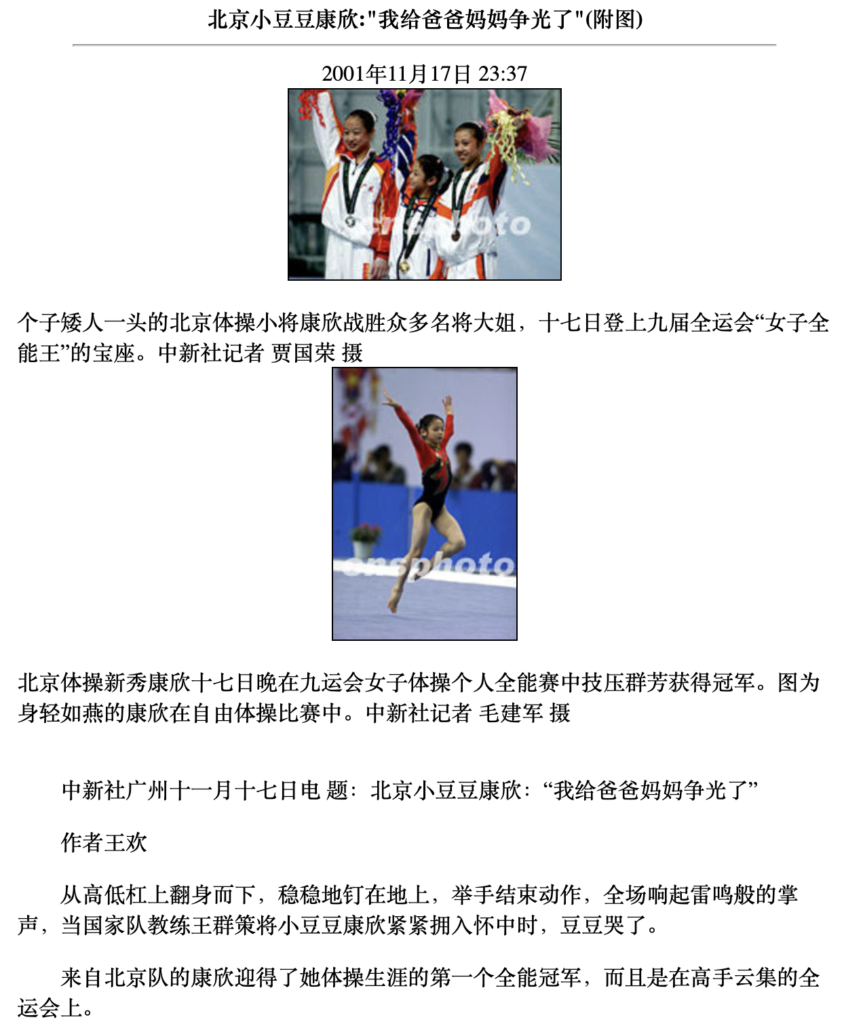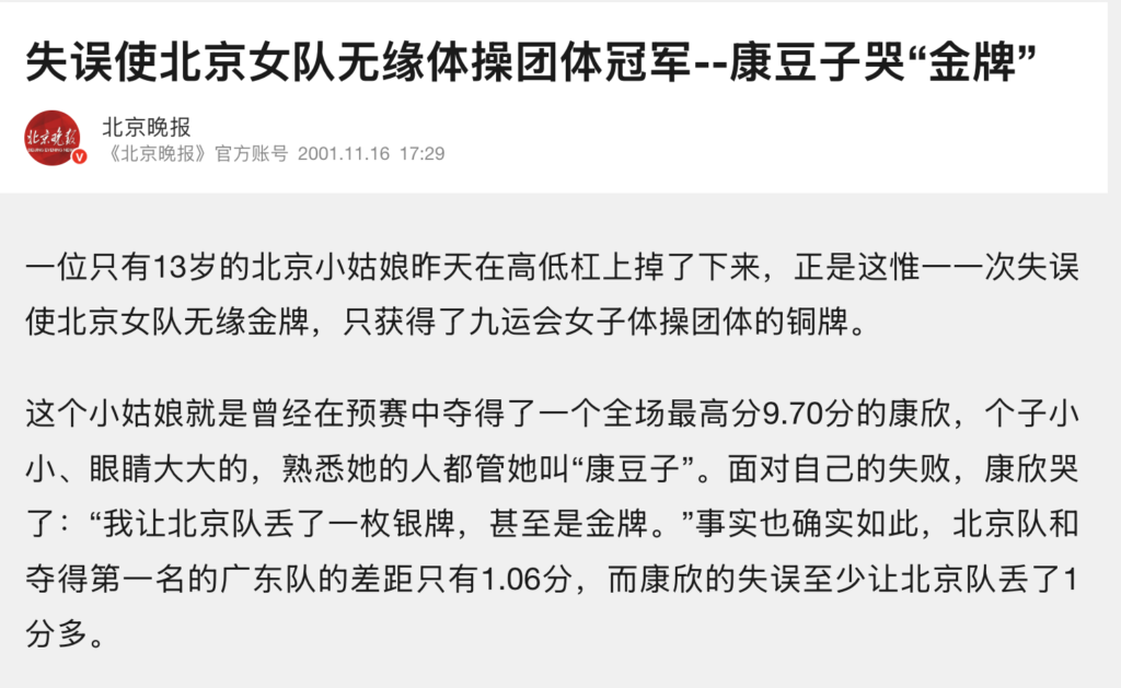 Kang Xin was one of the main stories of the 2001 National Games, and overwhelmingly, the newspapers thought that she was 13 years old. For example, on November 16, 2001, the Beijing Evening News (北京晚报 ) wrote about Kang Xin’s fall from the uneven bars during the team competition: