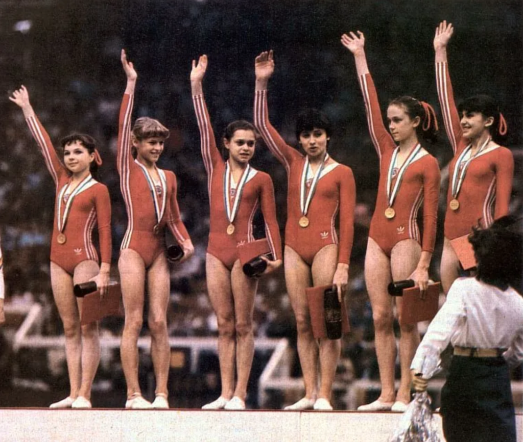 The Soviet team at the 1983 World Championships. From left to right: Bichukina, Mostepanova, Frolova, Shishova, Ilienko, Yurchenko